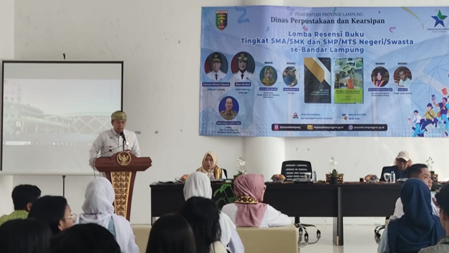 LAMPUNG, PAMUNGKASINDONESIA.ID – Kepala Dinas Perpustakaan dan Kearsipan (Perpussip) Provinsi Lampung, Riski Sofyan, S.STP., M.Si, membuka Lomba Resensi Buku di Nuwo Baca Zainal Abidin Pagaralam, Rabu (25/6/2025).