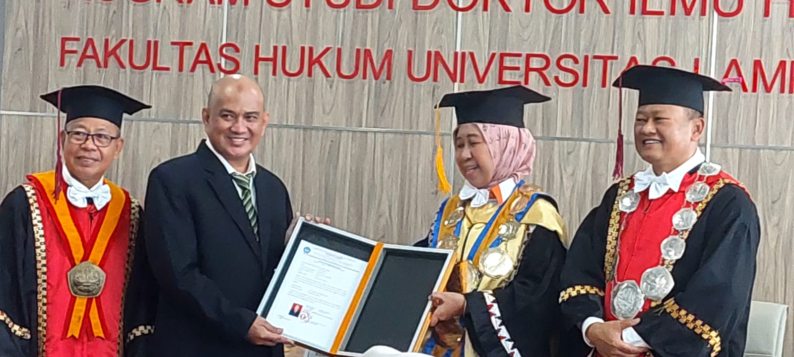 Ujian terbuka dipimpin langsung oleh Rektor Unila, Prof. Dr. Ir. Lusmeilia Afriani, DEA, IPM, ASEAN Eng., sebagai Ketua Penguji. Hadir pula Sekretaris Penguji Prof. Dr. Muhammad Akib, S.H., M.Hum. yang juga Ketua Prodi Doktor Ilmu Hukum Unila, serta Prof. Dr. HS Trisnanta, S.H., M.H. (promotor), Dr. Budiyono (ko-promotor), dan penguji internal lainnya, yakni Prof. Dr. Fakih, S.H., M.S., Dr. Muhtadi, S.H., M.H., dan Agus Triono, S.H., M.H., Ph.D.
